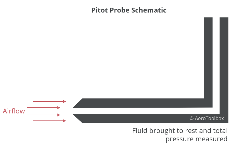 The pitot probe is located in a region of undisturbed airflow and consists of a cylindrical tube open on one side to the airstream. The forward motion of the aircraft forces air into the tube which is then brought to rest by the geometry of the probe. The pressure measured by the pitot tube is known as stagnation pressure or total pressure in accordance with the Bernoulli equation. This measured pressure is the sum of the static and dynamic pressures acting on the aircraft at the location of the probe.